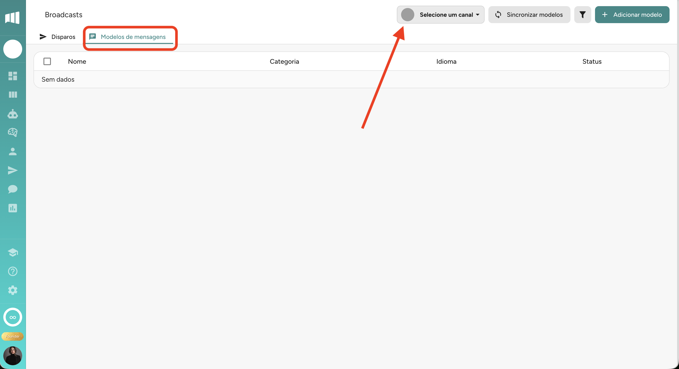 Vá em modelo de Mensagens e selecione o canal de WhatsApp desejado para realizar o disparo: