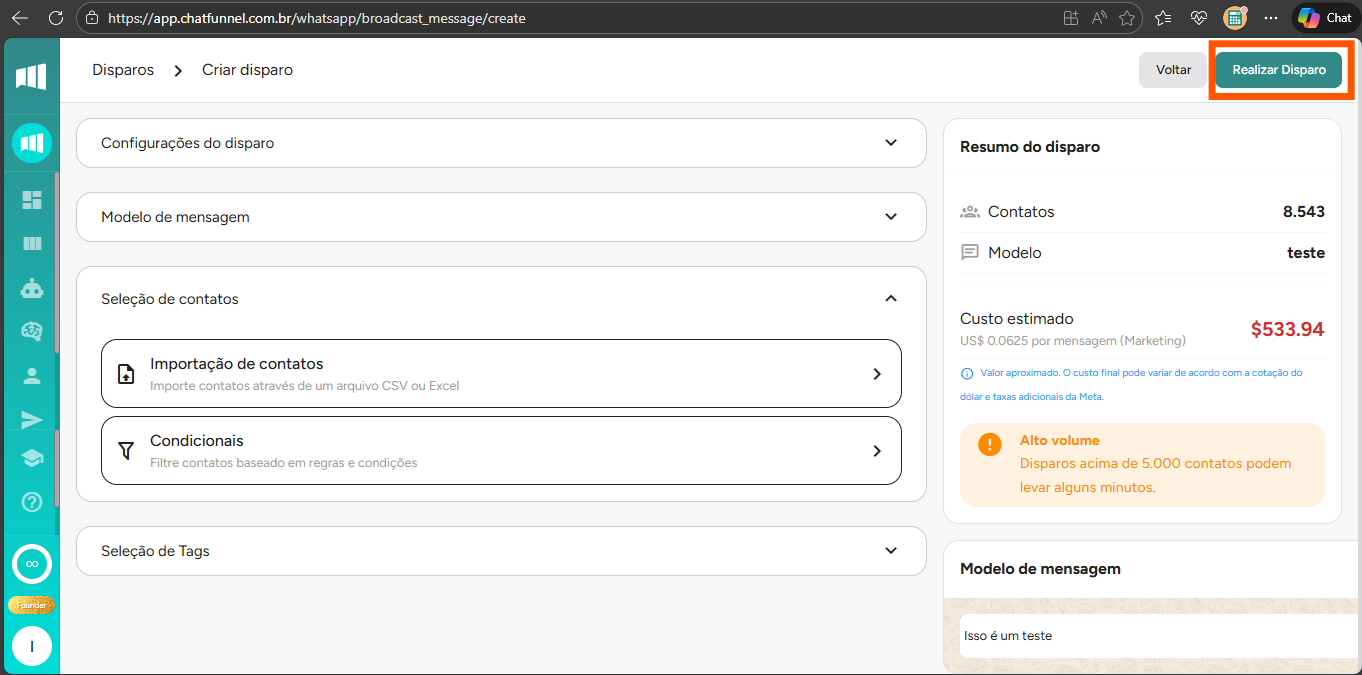 Em seguida, clica em realizar o disparo, em seu canto superior direito.