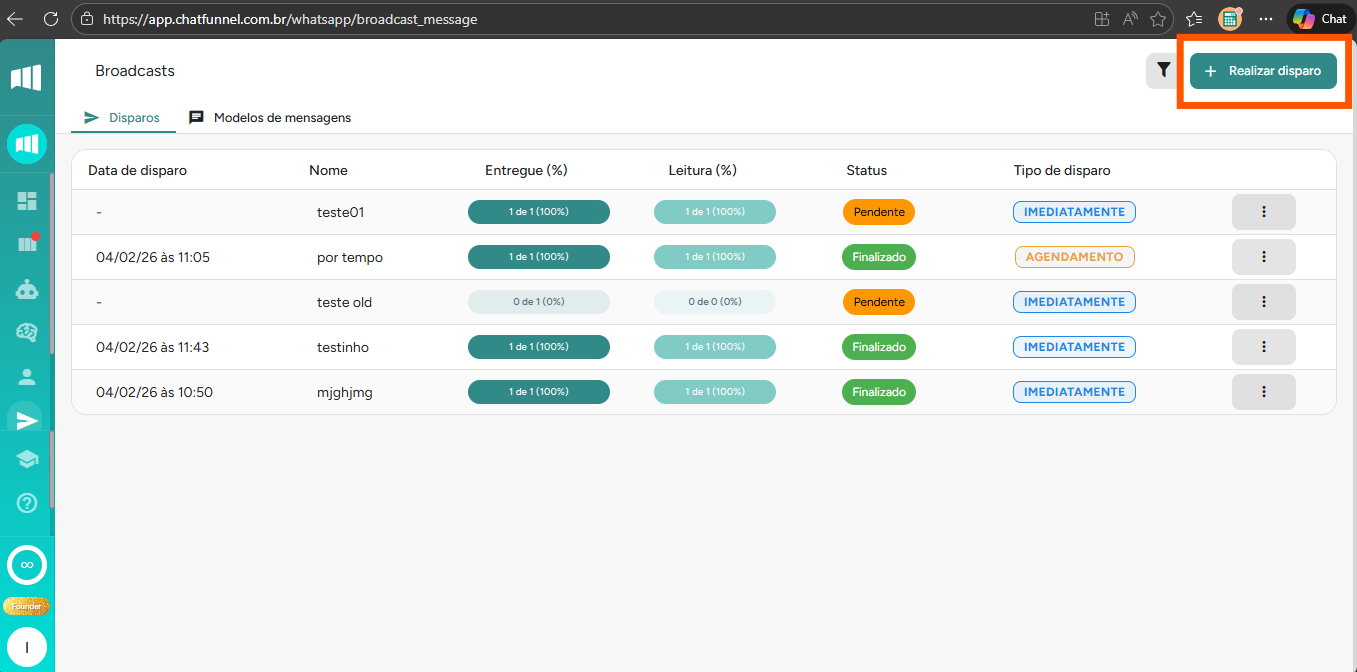 Você verá uma lista com todos os disparos já realizados na plataforma.