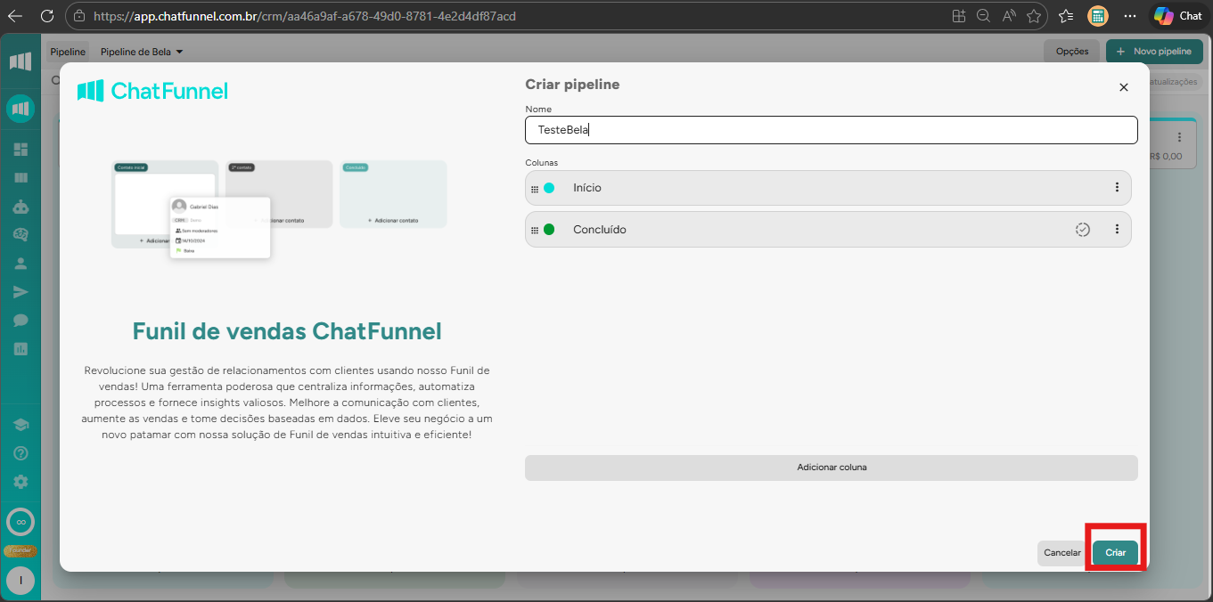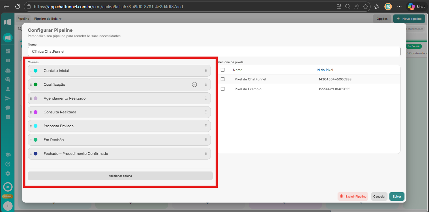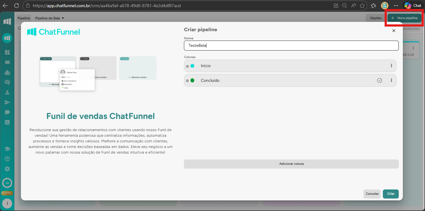 Ao criar um novo pipeline, o ChatFunnel já traz duas colunas padrão: