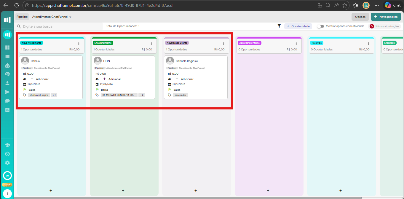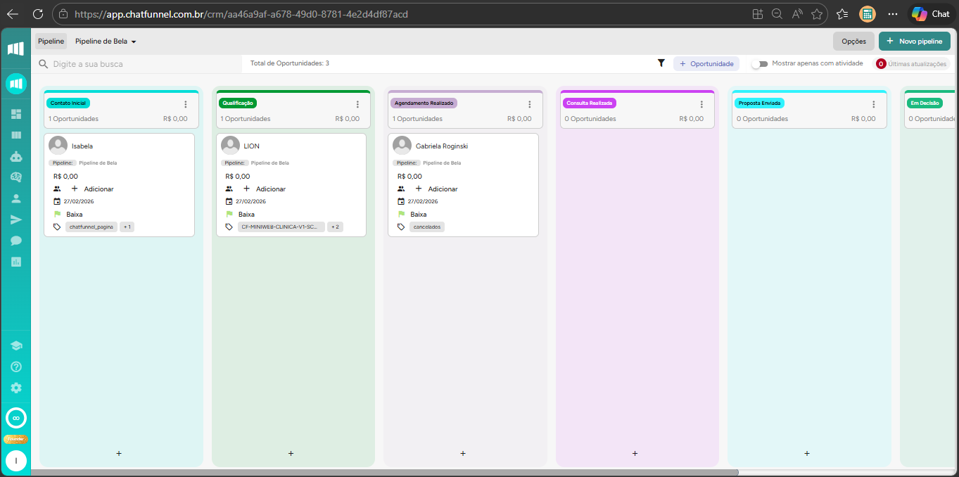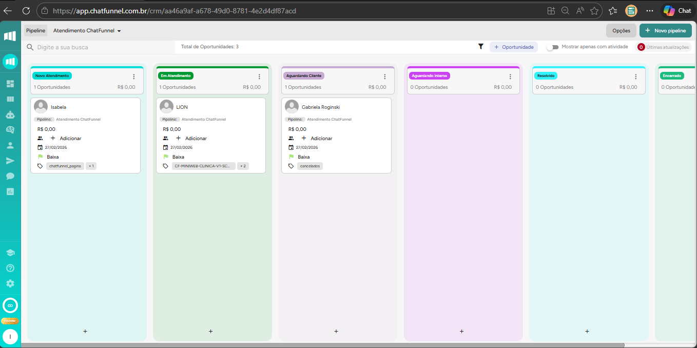 No ChatFunnel, ele funciona por meio de pipelines que representam cada fase do processo comercial ou de atendimento.