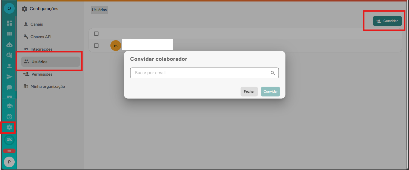 Caso o usuário ainda não esteja cadastrado na plataforma, será necessário enviar um convite para que ele possa acessar a conta.