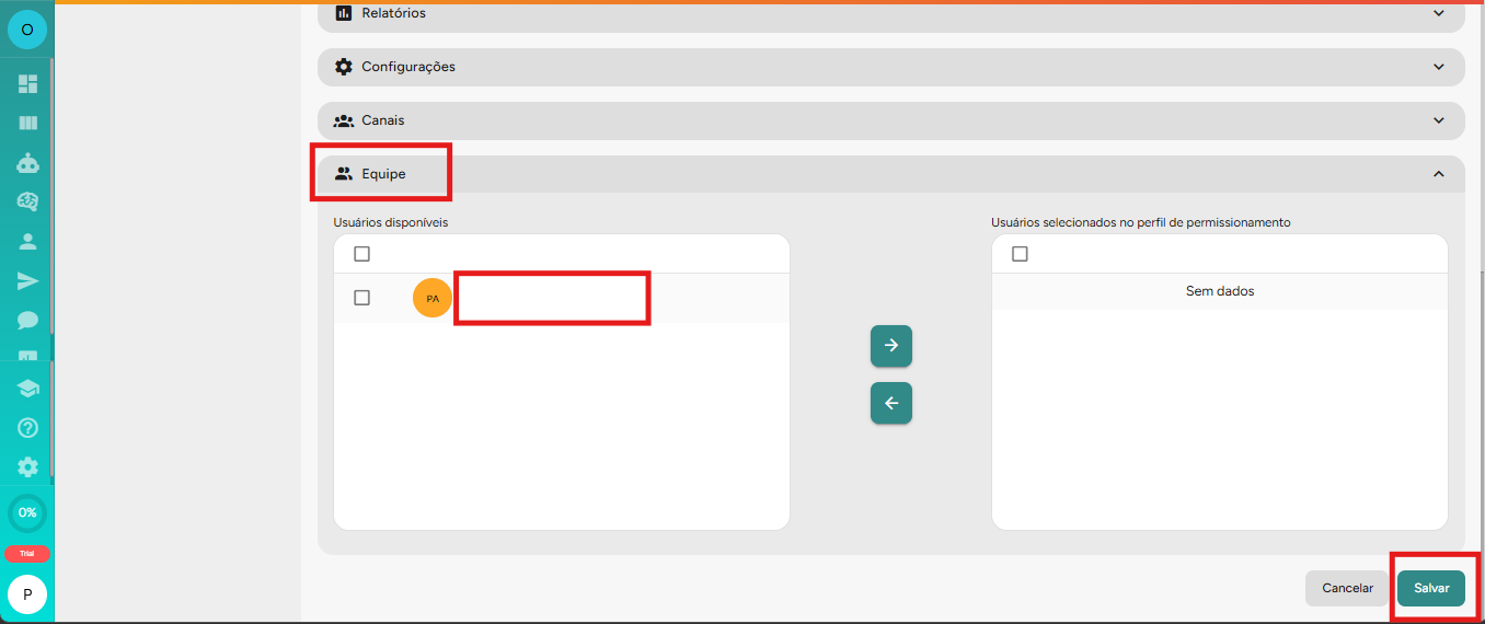 O usuário passará a fazer parte da equipe vinculada ao perfil de permissões