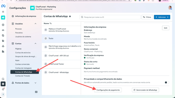 Caso a conta do WhatsApp Business não tenha um método de pagamento cadastrado na Meta, algumas funcionalidades podem ser afetadas.