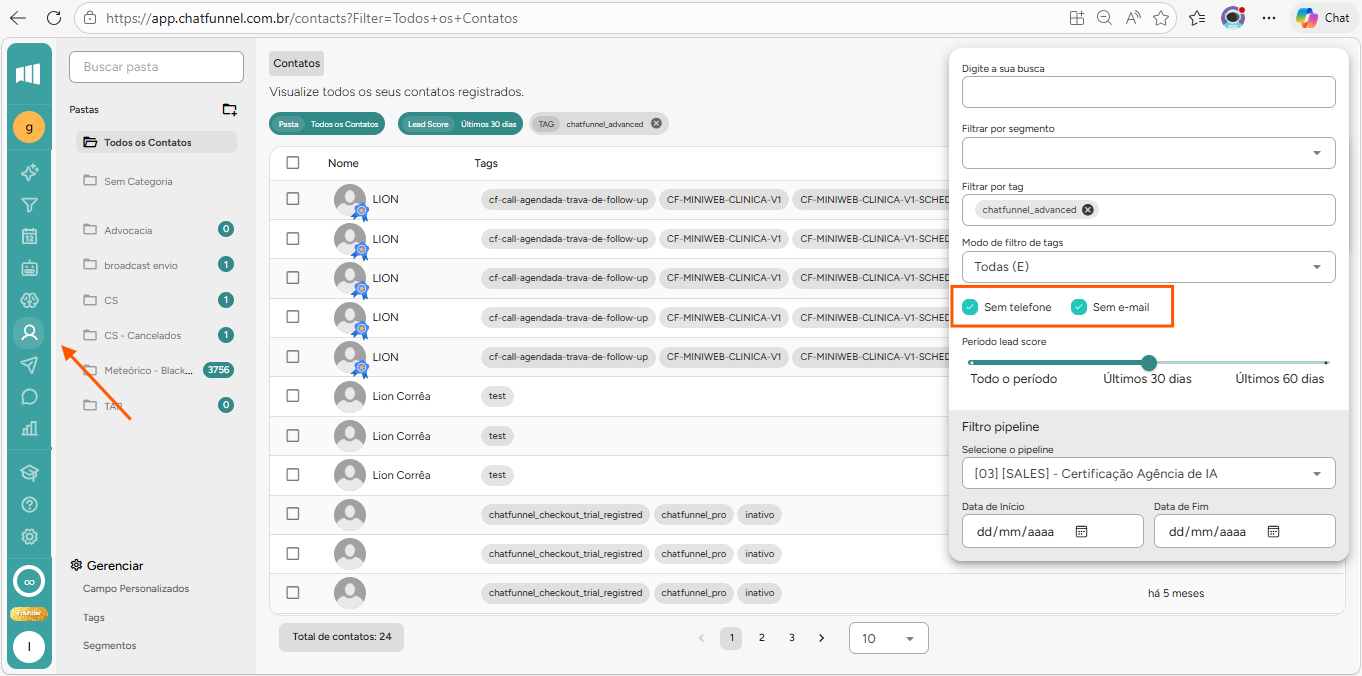 O filtro de “Sem telefone” e “Sem e-mail” permite localizar contatos com dados incompletos.