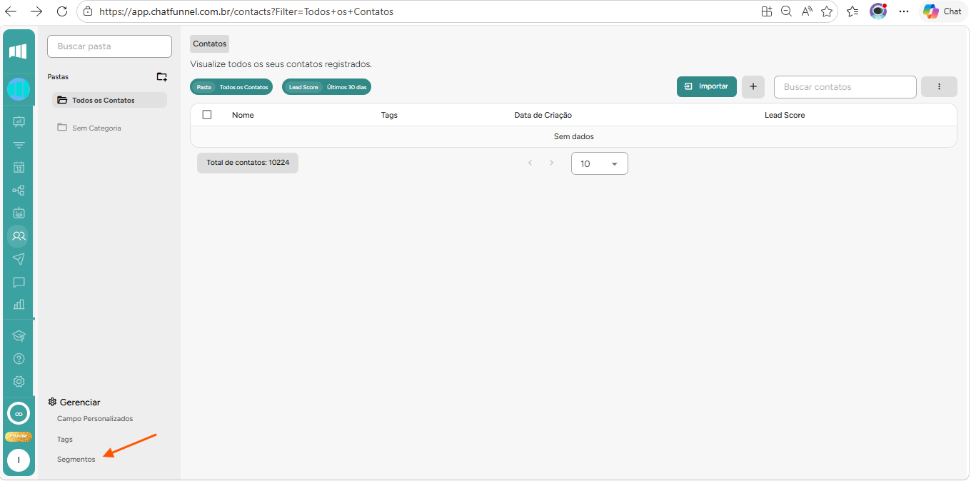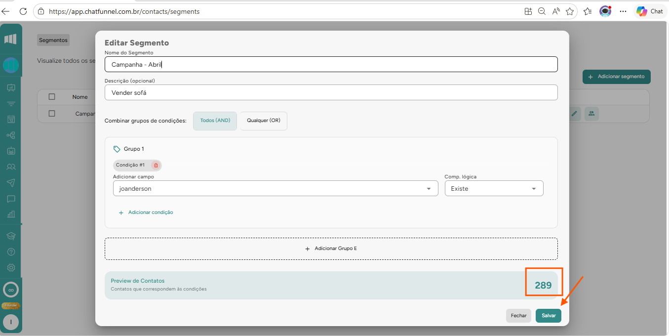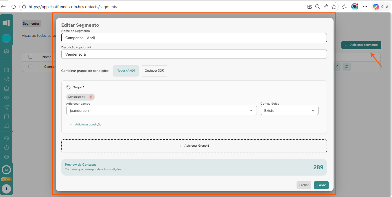 A segmentação no ChatFunnel funciona através de condições aplicadas aos contatos, permitindo filtrar e agrupar leads com base em dados como tags, campos personalizados e comportamentos.