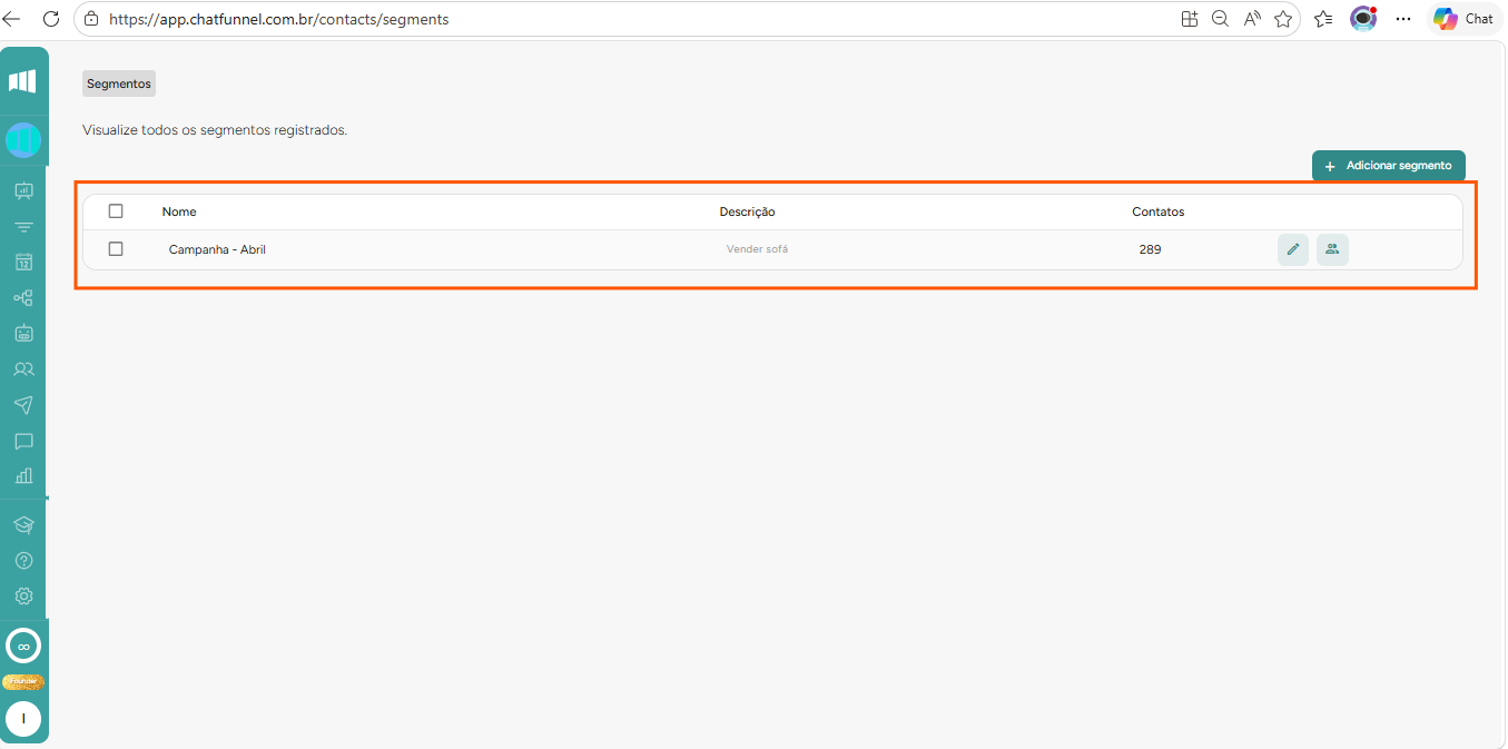Após salvar, o segmento aparecerá na lista com nome, descrição e quantidade de contatos.