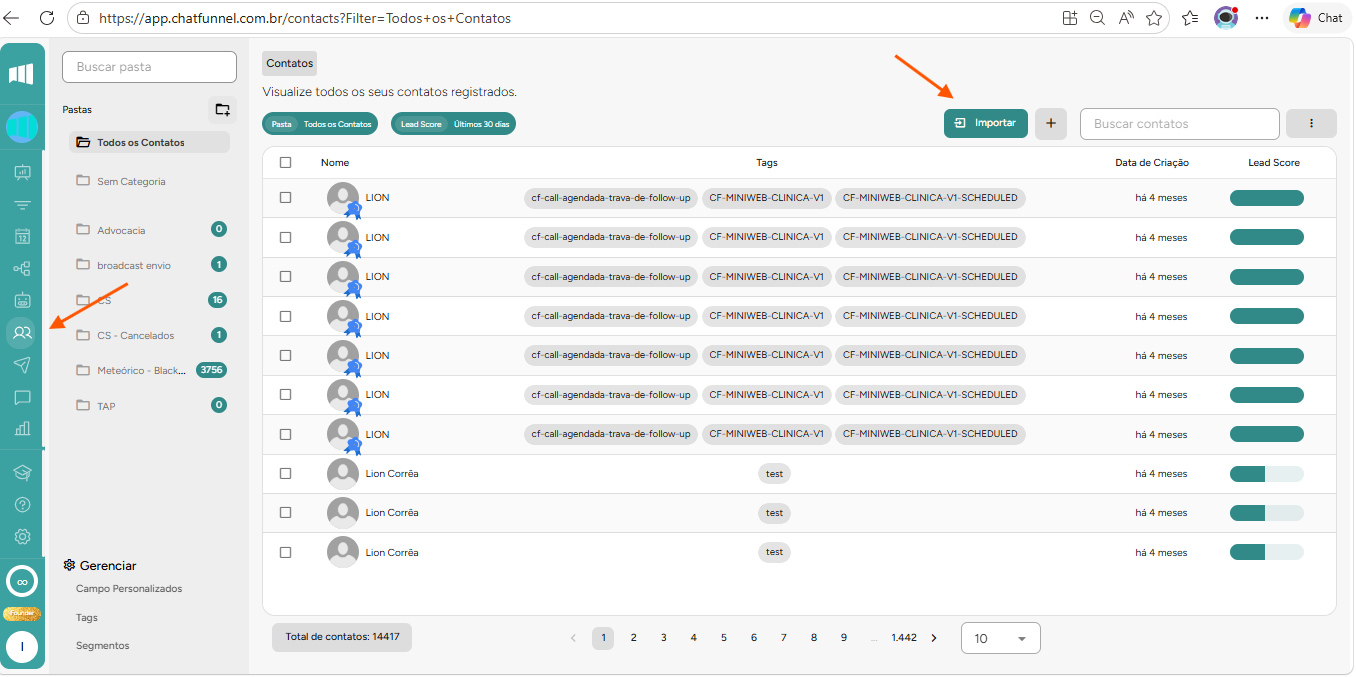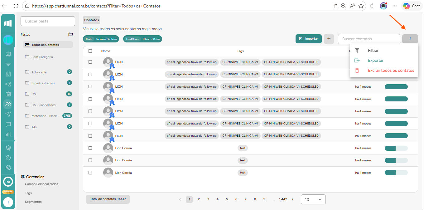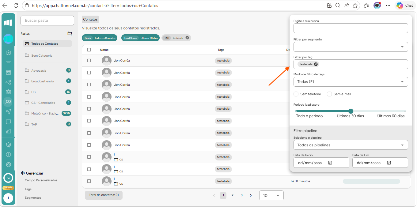 Após a importação, você pode validar se a tag foi aplicada corretamente utilizando o filtro de contatos.