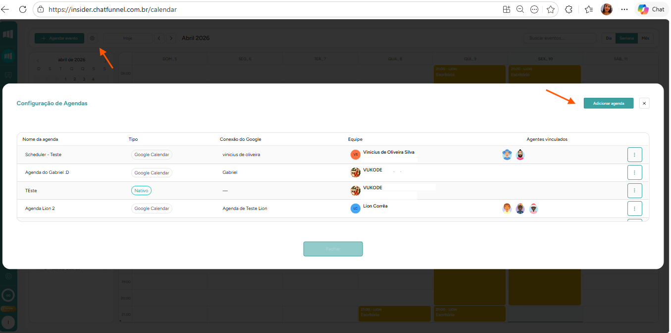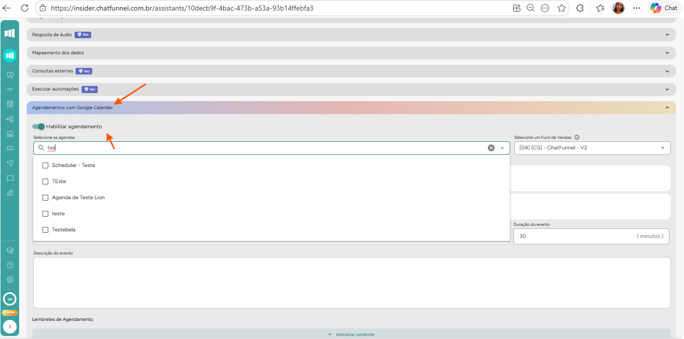Para vincular uma agenda ao agente, é necessário que a agenda já esteja previamente criada no ChatFunnel.