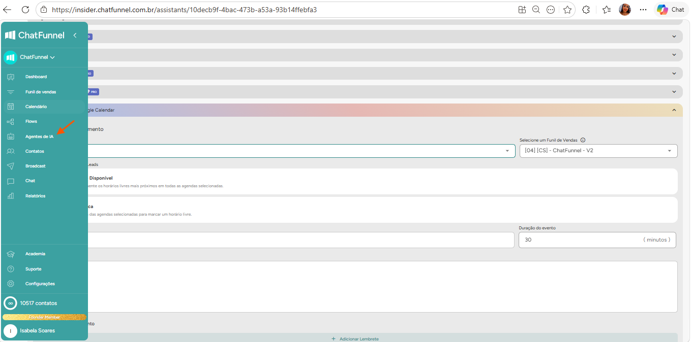 A agenda nativa pode ser utilizada junto aos agentes de IA do ChatFunnel, permitindo que o próprio assistente:
